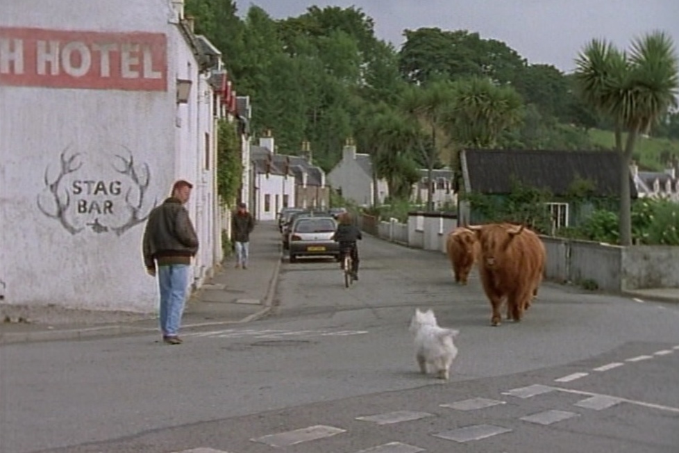 愛犬ウィー・ジョック(Wee Jock)を連れて散歩するヘイミッシュと、村をうろつくハイランドキャトル。(「wee」とはスコットランド英語で「小さい」「少し」という意味。ジョックはウェスト・ハイランド・ホワイト・テリアというスコットランド原産の犬種(ウェスティ(Westie)という愛称で呼ばれることも)