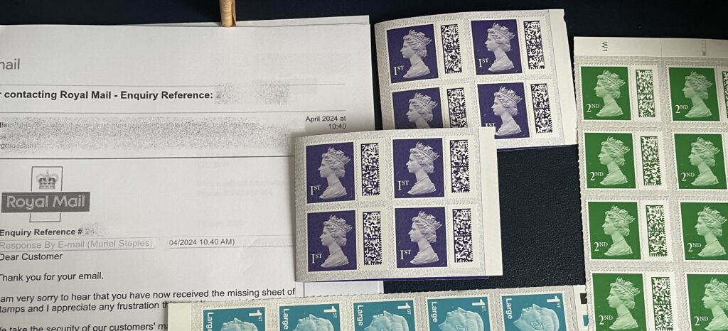 「投函してから写真を撮っておけばよかったとすぐに後悔しました。でも送った枚数は正確に言えます」と、切手の種類と枚数、それから送った台紙の枚数など詳細に説明しました。さらに「私の手元にそれらはもうないので確実に入れているはずです。恐れ入りますが、紛失したとすればロイヤルメールの中ではないでしょうか?」とまでつけ加えました。だって本当だから。