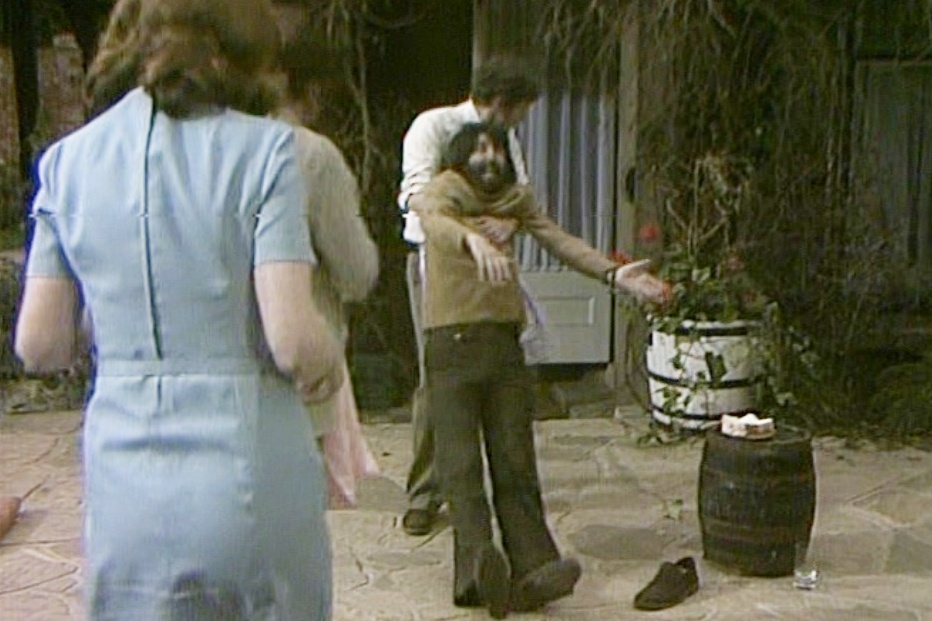午後9時。7月のイギリスではまだ明るい時刻。レジとサラは酔っているノーマンを裏庭に運び出します。「誰も僕のことを愛していない!」と叫ぶノーマン。サラは横に座って説教を始めますが(酔っている人に語りかけても無駄だとは思うのですが)、ノーマンは手をつないだりキスをしようとしたりするため、サラは慌てて離れます。